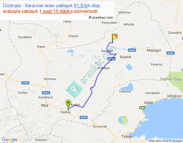 Düzkışla - Sarıpınar arası yaklaşık olarak 90 km/h ile yukarıda belirtilen sürede olup, iki yerin kuş uçuşu uzaklığı (mesafesi) 67'dir. Yolculuk otobüsle 1 saat 37 dakika sürmektedir.