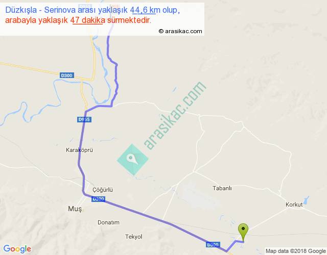 Düzkışla - Serinova arası yaklaşık olarak 90 km/h ile yukarıda belirtilen sürede olup, iki yerin kuş uçuşu uzaklığı (mesafesi) 30'dir. Yolculuk otobüsle 1 saat 1 dakika sürmektedir.