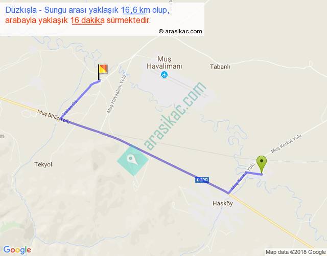 Düzkışla - Sungu arası yaklaşık olarak 90 km/h ile yukarıda belirtilen sürede olup, iki yerin kuş uçuşu uzaklığı (mesafesi) 11'dir. Yolculuk otobüsle 20 dakika sürmektedir.