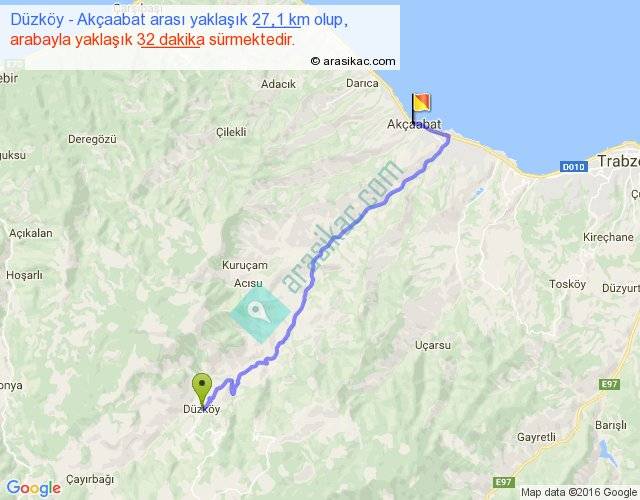 Düzköy - Akçaabat arası yaklaşık olarak 90 km/h ile yukarıda belirtilen sürede olup, iki yerin kuş uçuşu uzaklığı (mesafesi) 20'dir. Yolculuk otobüsle 41 dakika sürmektedir.