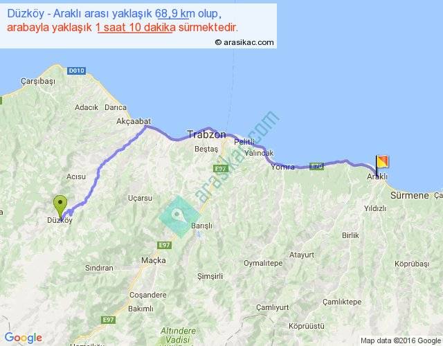 Düzköy - Araklı arası yaklaşık olarak 90 km/h ile yukarıda belirtilen sürede olup, iki yerin kuş uçuşu uzaklığı (mesafesi) 53'dir. Yolculuk otobüsle 1 saat 31 dakika sürmektedir.