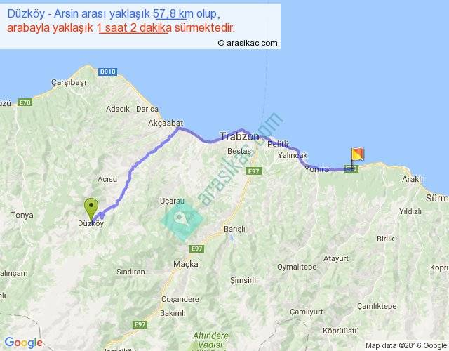 Düzköy - Arsin arası yaklaşık olarak 90 km/h ile yukarıda belirtilen sürede olup, iki yerin kuş uçuşu uzaklığı (mesafesi) 44'dir. Yolculuk otobüsle 1 saat 20 dakika sürmektedir.