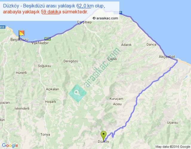 Düzköy - Beşikdüzü arası yaklaşık olarak 90 km/h ile yukarıda belirtilen sürede olup, iki yerin kuş uçuşu uzaklığı (mesafesi) 25'dir. Yolculuk otobüsle 1 saat 16 dakika sürmektedir.