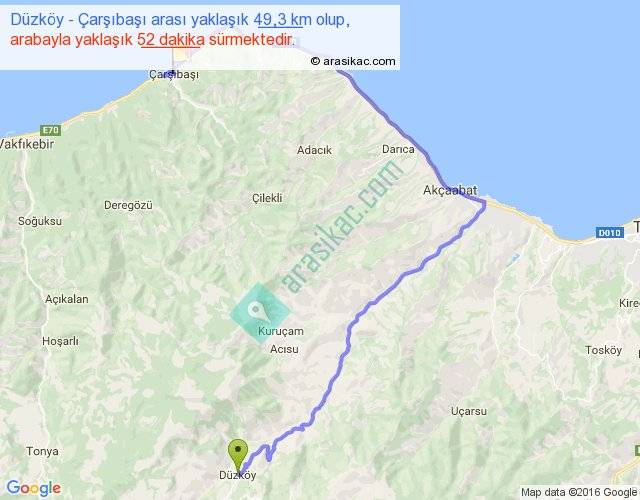 Düzköy - Çarşıbaşı arası yaklaşık olarak 90 km/h ile yukarıda belirtilen sürede olup, iki yerin kuş uçuşu uzaklığı (mesafesi) 23'dir. Yolculuk otobüsle 1 saat 7 dakika sürmektedir.