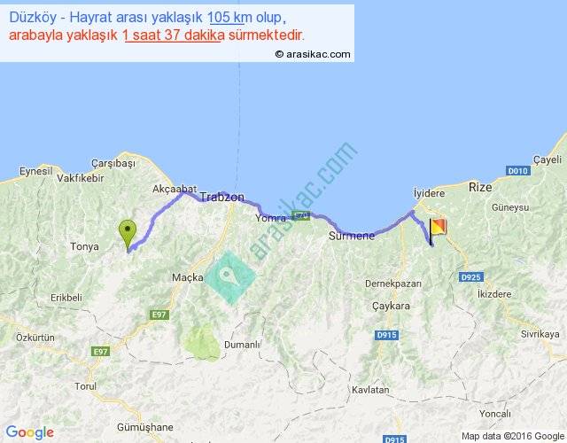 Düzköy - Hayrat arası yaklaşık olarak 90 km/h ile yukarıda belirtilen sürede olup, iki yerin kuş uçuşu uzaklığı (mesafesi) 79'dir. Yolculuk otobüsle 2 saat 6 dakika sürmektedir.