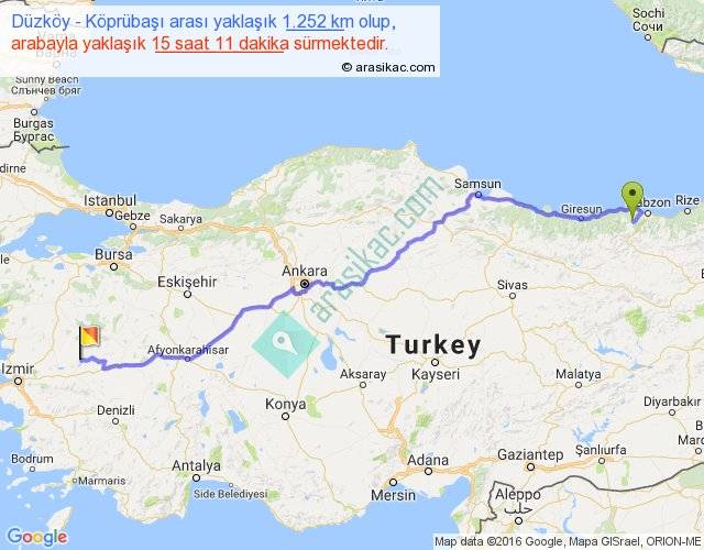 Düzköy - Köprübaşı arası yaklaşık olarak 90 km/h ile yukarıda belirtilen sürede olup, iki yerin kuş uçuşu uzaklığı (mesafesi) 964'dir. Eğer belirtilen yerler arasında uçak seferi var ise bu süre uçakla 1 saat 28 dakika'ya kadar düşebilir. Yolculuk otobüsle 19 saat 44 dakika sürmektedir.