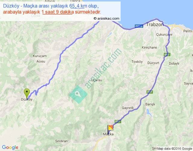 Düzköy - Maçka arası yaklaşık olarak 90 km/h ile yukarıda belirtilen sürede olup, iki yerin kuş uçuşu uzaklığı (mesafesi) 17'dir. Yolculuk otobüsle 1 saat 29 dakika sürmektedir.