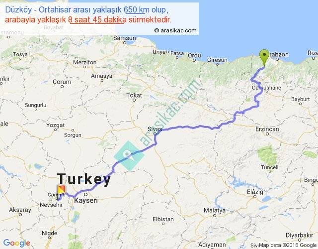 Düzköy - Ortahisar arası yaklaşık olarak 90 km/h ile yukarıda belirtilen sürede olup, iki yerin kuş uçuşu uzaklığı (mesafesi) 461'dir. Eğer belirtilen yerler arasında uçak seferi var ise bu süre uçakla 42 dakika'ya kadar düşebilir. Yolculuk otobüsle 11 saat 22 dakika sürmektedir.