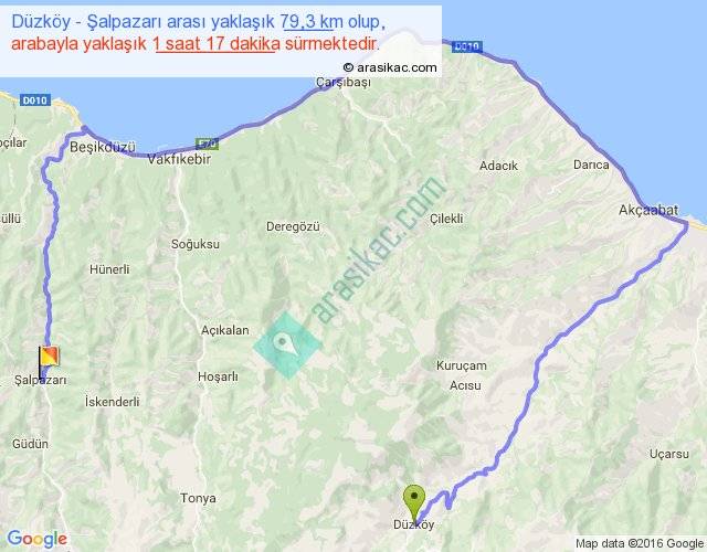 Düzköy - Şalpazarı arası yaklaşık olarak 90 km/h ile yukarıda belirtilen sürede olup, iki yerin kuş uçuşu uzaklığı (mesafesi) 21'dir. Yolculuk otobüsle 1 saat 40 dakika sürmektedir.