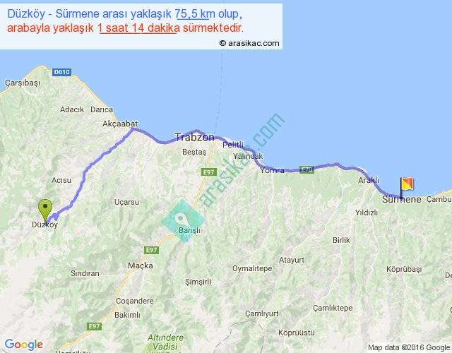 Düzköy - Sürmene arası yaklaşık olarak 90 km/h ile yukarıda belirtilen sürede olup, iki yerin kuş uçuşu uzaklığı (mesafesi) 58'dir. Yolculuk otobüsle 1 saat 36 dakika sürmektedir.