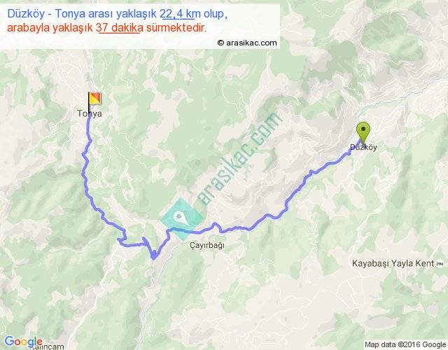 Düzköy - Tonya arası yaklaşık olarak 90 km/h ile yukarıda belirtilen sürede olup, iki yerin kuş uçuşu uzaklığı (mesafesi) 11'dir. Yolculuk otobüsle 48 dakika sürmektedir.