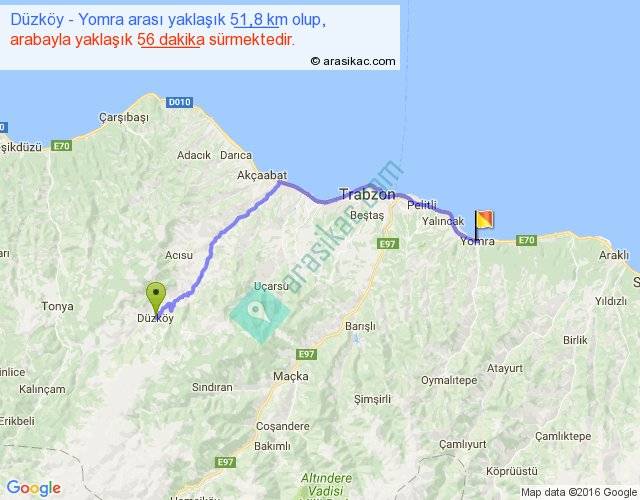 Düzköy - Yomra arası yaklaşık olarak 90 km/h ile yukarıda belirtilen sürede olup, iki yerin kuş uçuşu uzaklığı (mesafesi) 38'dir. Yolculuk otobüsle 1 saat 12 dakika sürmektedir.