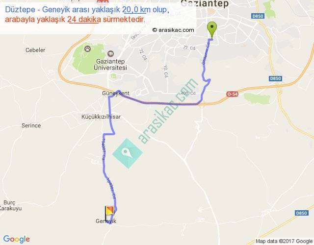 Düztepe - Geneyik arası yaklaşık olarak 90 km/h ile yukarıda belirtilen sürede olup, iki yerin kuş uçuşu uzaklığı (mesafesi) 13'dir. Yolculuk otobüsle 31 dakika sürmektedir.
