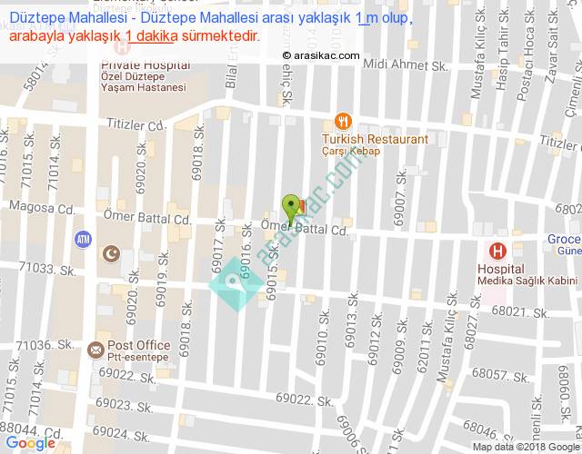 Düztepe Mahallesi - Düztepe Mahallesi arası yaklaşık olarak 90 km/h ile yukarıda belirtilen sürede olup, iki yerin kuş uçuşu uzaklığı (mesafesi) 0'dir. Yolculuk otobüsle 1 dakika sürmektedir.