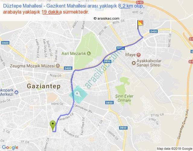 Düztepe Mahallesi - Gazikent Mahallesi arası yaklaşık olarak 90 km/h ile yukarıda belirtilen sürede olup, iki yerin kuş uçuşu uzaklığı (mesafesi) 7'dir. Yolculuk otobüsle 24 dakika sürmektedir.