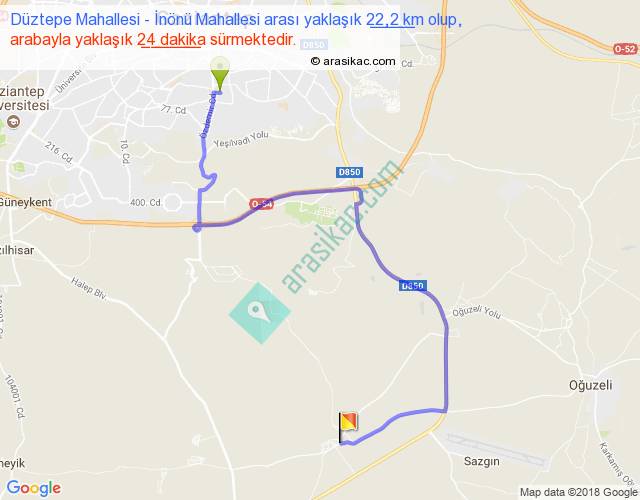 Düztepe Mahallesi - İnönü Mahallesi arası yaklaşık olarak 90 km/h ile yukarıda belirtilen sürede olup, iki yerin kuş uçuşu uzaklığı (mesafesi) 11'dir. Yolculuk otobüsle 31 dakika sürmektedir.