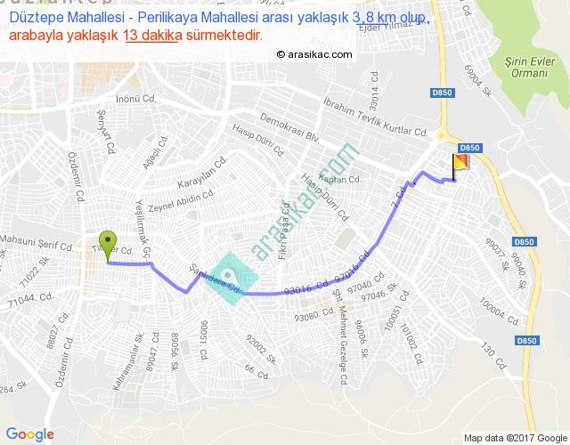 Düztepe Mahallesi - Perilikaya Mahallesi arası yaklaşık olarak 90 km/h ile yukarıda belirtilen sürede olup, iki yerin kuş uçuşu uzaklığı (mesafesi) 3'dir. Yolculuk otobüsle 16 dakika sürmektedir.