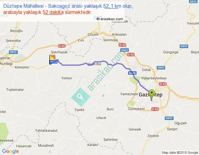 Düztepe Mahallesi - Sakcagoz arası yaklaşık olarak 90 km/h ile yukarıda belirtilen sürede olup, iki yerin kuş uçuşu uzaklığı (mesafesi) 42'dir. Yolculuk otobüsle 1 saat 7 dakika sürmektedir.