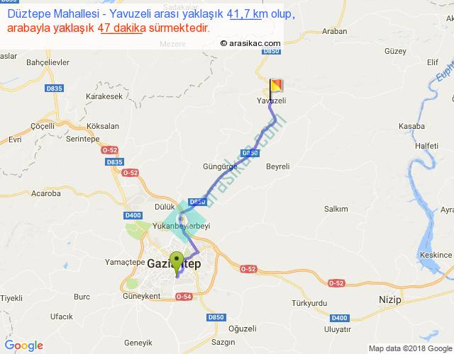 Düztepe Mahallesi - Yavuzeli arası yaklaşık olarak 90 km/h ile yukarıda belirtilen sürede olup, iki yerin kuş uçuşu uzaklığı (mesafesi) 34'dir. Yolculuk otobüsle 1 saat 1 dakika sürmektedir.