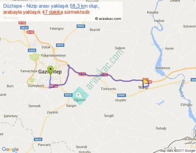 Düztepe - Nizip arası yaklaşık olarak 90 km/h ile yukarıda belirtilen sürede olup, iki yerin kuş uçuşu uzaklığı (mesafesi) 37'dir. Yolculuk otobüsle 1 saat 1 dakika sürmektedir.