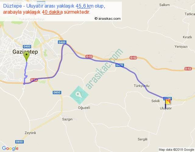 Düztepe - Uluyatır arası yaklaşık olarak 90 km/h ile yukarıda belirtilen sürede olup, iki yerin kuş uçuşu uzaklığı (mesafesi) 29'dir. Yolculuk otobüsle 52 dakika sürmektedir.