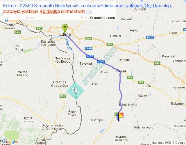 Edirne - 22360 Kırcasalih Belediyesi Uzunköprü Edirne arası yaklaşık olarak 90 km/h ile yukarıda belirtilen sürede olup, iki yerin kuş uçuşu uzaklığı (mesafesi) 40'dir. Yolculuk otobüsle 59 dakika sürmektedir.