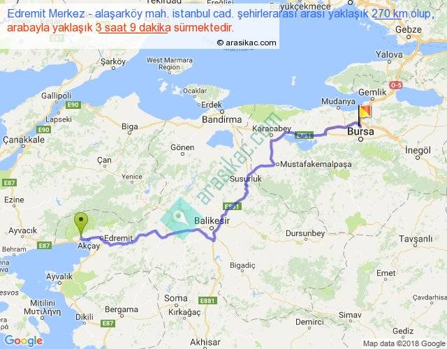 Edremit Merkez - alaşarköy mah. istanbul cad. şehirlerarası arası yaklaşık olarak 90 km/h ile yukarıda belirtilen sürede olup, iki yerin kuş uçuşu uzaklığı (mesafesi) 200'dir. Yolculuk otobüsle 4 saat 5 dakika sürmektedir.