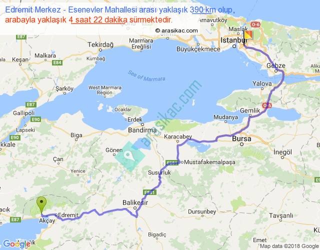 Edremit Merkez - Esenevler Mahallesi arası yaklaşık olarak 90 km/h ile yukarıda belirtilen sürede olup, iki yerin kuş uçuşu uzaklığı (mesafesi) 244'dir. Yolculuk otobüsle 5 saat 40 dakika sürmektedir.