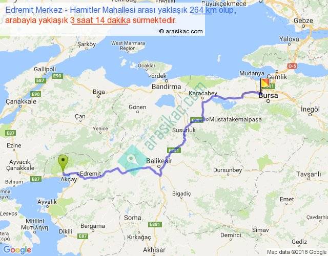 Edremit Merkez - Hamitler Mahallesi arası yaklaşık olarak 90 km/h ile yukarıda belirtilen sürede olup, iki yerin kuş uçuşu uzaklığı (mesafesi) 194'dir. Yolculuk otobüsle 4 saat 12 dakika sürmektedir.