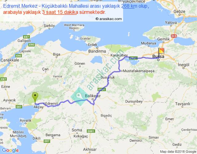 Edremit Merkez - Küçükbalıklı Mahallesi arası yaklaşık olarak 90 km/h ile yukarıda belirtilen sürede olup, iki yerin kuş uçuşu uzaklığı (mesafesi) 200'dir. Yolculuk otobüsle 4 saat 13 dakika sürmektedir.