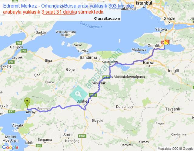 Edremit Merkez - Orhangazi Bursa arası yaklaşık olarak 90 km/h ile yukarıda belirtilen sürede olup, iki yerin kuş uçuşu uzaklığı (mesafesi) 229'dir. Yolculuk otobüsle 4 saat 34 dakika sürmektedir.