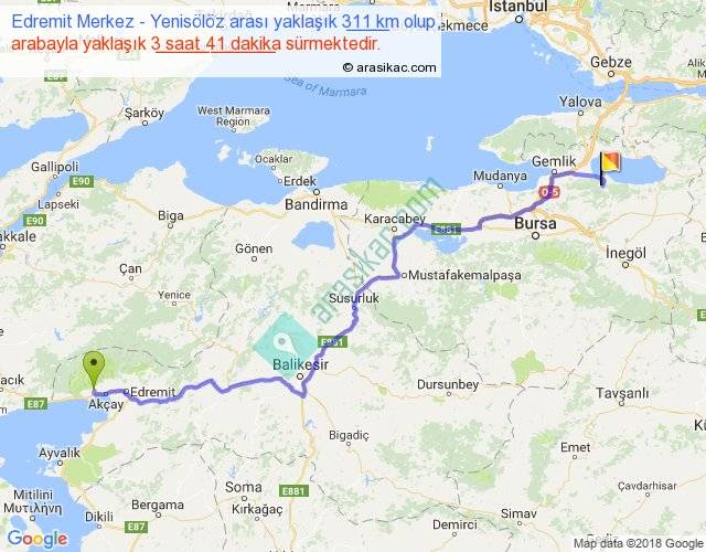 Edremit Merkez - Yenisölöz arası yaklaşık olarak 90 km/h ile yukarıda belirtilen sürede olup, iki yerin kuş uçuşu uzaklığı (mesafesi) 231'dir. Yolculuk otobüsle 4 saat 47 dakika sürmektedir.