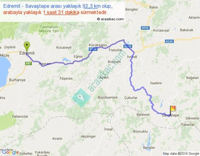 Edremit - Savaştepe arası yaklaşık olarak 90 km/h ile yukarıda belirtilen sürede olup, iki yerin kuş uçuşu uzaklığı (mesafesi) 59'dir. Yolculuk otobüsle 1 saat 58 dakika sürmektedir.