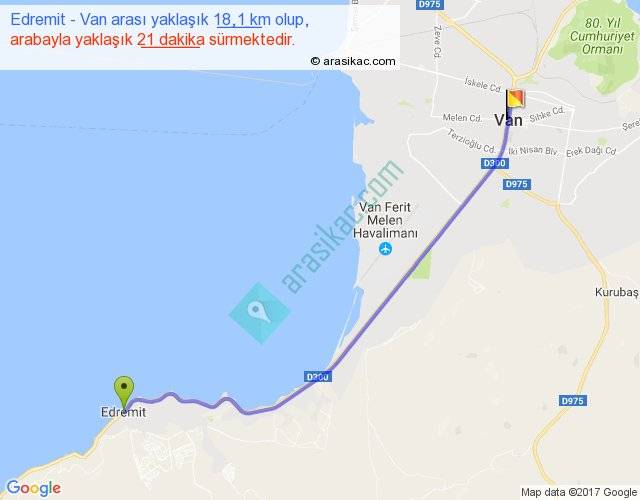 Edremit - Van arası yaklaşık olarak 90 km/h ile yukarıda belirtilen sürede olup, iki yerin kuş uçuşu uzaklığı (mesafesi) 1407'dir. Eğer belirtilen yerler arasında uçak seferi var ise bu süre uçakla 2 saat 09 dakika'ya kadar düşebilir. Yolculuk otobüsle 1 gün 3 saat sürmektedir.