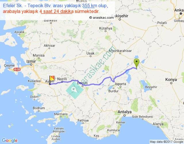 Efeler Sk. - Tepecik Blv. arası yaklaşık olarak 90 km/h ile yukarıda belirtilen sürede olup, iki yerin kuş uçuşu uzaklığı (mesafesi) 292'dir. Eğer belirtilen yerler arasında uçak seferi var ise bu süre uçakla 26 dakika'ya kadar düşebilir. Yolculuk otobüsle 5 saat 43 dakika sürmektedir.