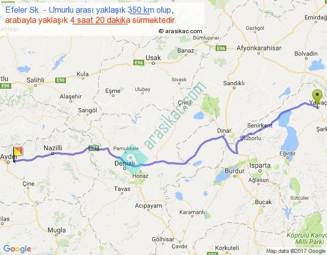 Efeler Sk. - Umurlu arası yaklaşık olarak 90 km/h ile yukarıda belirtilen sürede olup, iki yerin kuş uçuşu uzaklığı (mesafesi) 288'dir. Eğer belirtilen yerler arasında uçak seferi var ise bu süre uçakla 26 dakika'ya kadar düşebilir. Yolculuk otobüsle 5 saat 38 dakika sürmektedir.