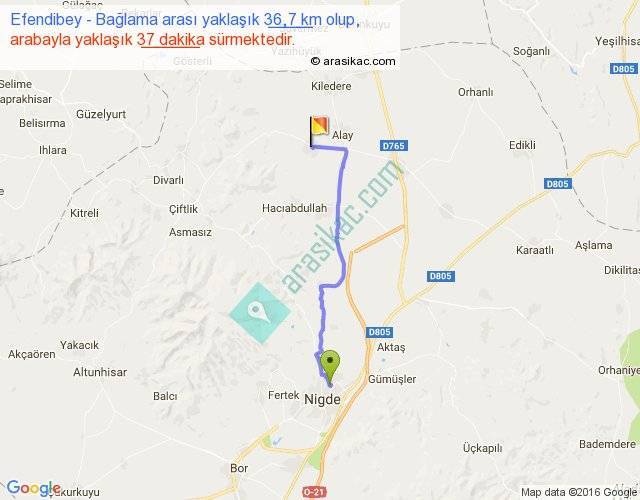 Efendibey - Bağlama arası yaklaşık olarak 90 km/h ile yukarıda belirtilen sürede olup, iki yerin kuş uçuşu uzaklığı (mesafesi) 29'dir. Yolculuk otobüsle 48 dakika sürmektedir.