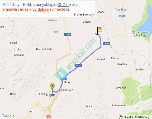 Efendibey - Edikli arası yaklaşık olarak 90 km/h ile yukarıda belirtilen sürede olup, iki yerin kuş uçuşu uzaklığı (mesafesi) 37'dir. Yolculuk otobüsle 48 dakika sürmektedir.