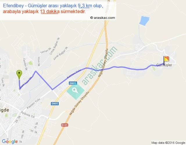 Efendibey - Gümüşler arası yaklaşık olarak 90 km/h ile yukarıda belirtilen sürede olup, iki yerin kuş uçuşu uzaklığı (mesafesi) 8'dir. Yolculuk otobüsle 16 dakika sürmektedir.