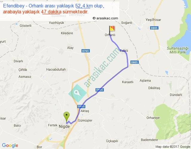 Efendibey - Orhanlı arası yaklaşık olarak 90 km/h ile yukarıda belirtilen sürede olup, iki yerin kuş uçuşu uzaklığı (mesafesi) 39'dir. Yolculuk otobüsle 1 saat 1 dakika sürmektedir.