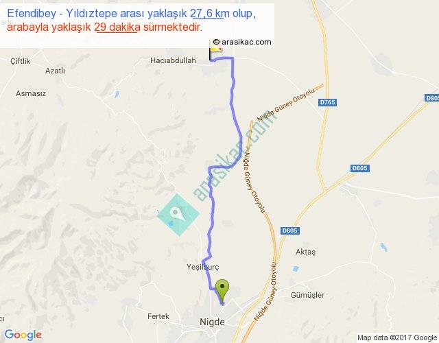Efendibey - Yıldıztepe arası yaklaşık olarak 90 km/h ile yukarıda belirtilen sürede olup, iki yerin kuş uçuşu uzaklığı (mesafesi) 21'dir. Yolculuk otobüsle 37 dakika sürmektedir.