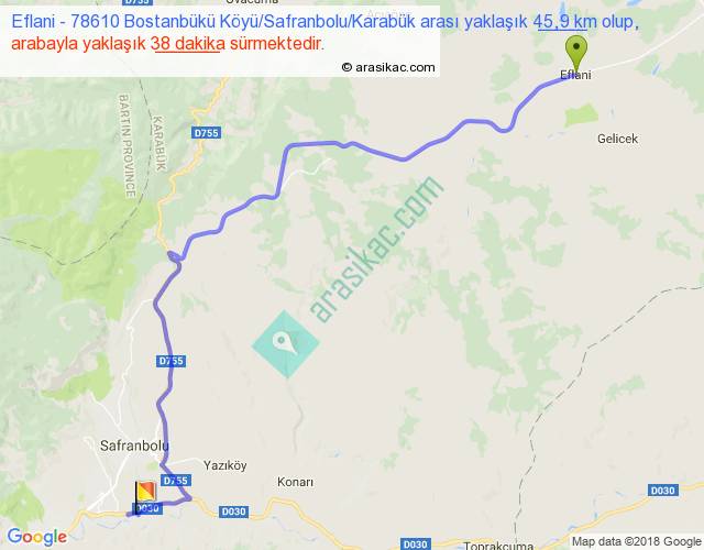 Eflani - 78610 Bostanbükü Köyü Safranbolu Karabük arası yaklaşık olarak 90 km/h ile yukarıda belirtilen sürede olup, iki yerin kuş uçuşu uzaklığı (mesafesi) 32'dir. Yolculuk otobüsle 49 dakika sürmektedir.