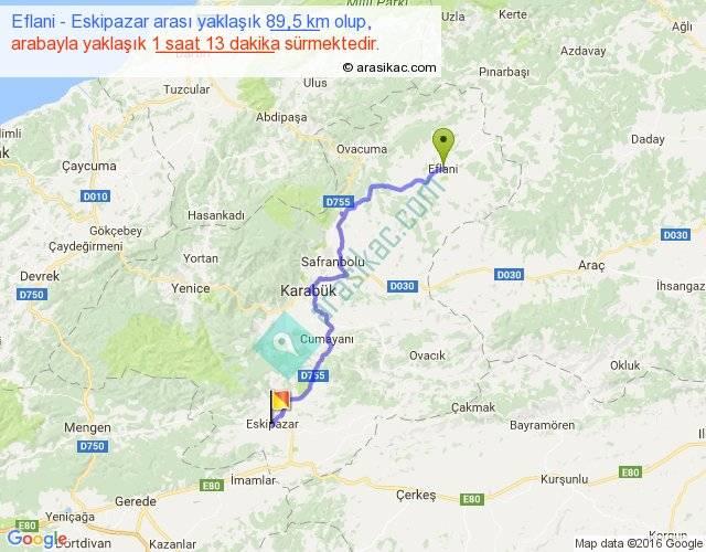 Eflani - Eskipazar arası yaklaşık olarak 90 km/h ile yukarıda belirtilen sürede olup, iki yerin kuş uçuşu uzaklığı (mesafesi) 64'dir. Yolculuk otobüsle 1 saat 34 dakika sürmektedir.