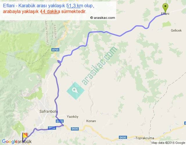 Eflani - Karabük arası yaklaşık olarak 90 km/h ile yukarıda belirtilen sürede olup, iki yerin kuş uçuşu uzaklığı (mesafesi) 38'dir. Yolculuk otobüsle 57 dakika sürmektedir.