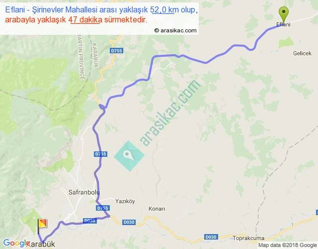 Eflani - Şirinevler Mahallesi arası yaklaşık olarak 90 km/h ile yukarıda belirtilen sürede olup, iki yerin kuş uçuşu uzaklığı (mesafesi) 37'dir. Yolculuk otobüsle 1 saat 1 dakika sürmektedir.
