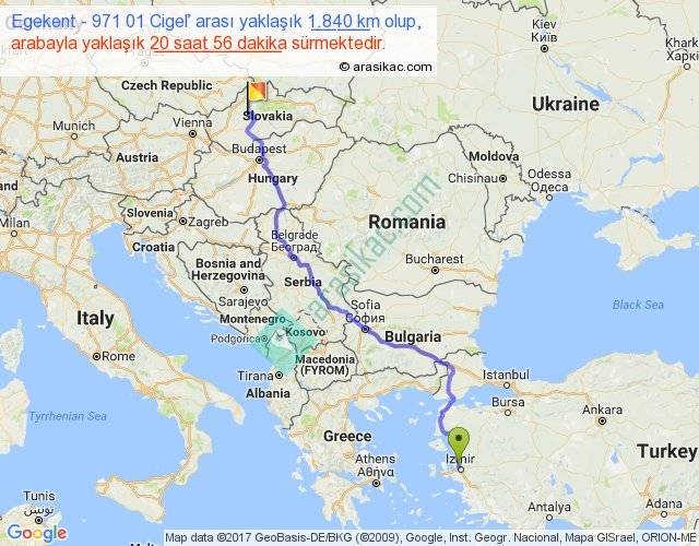 Egekent - 971 01 Cigeľ arası yaklaşık olarak 90 km/h ile yukarıda belirtilen sürede olup, iki yerin kuş uçuşu uzaklığı (mesafesi) 1313'dir. Eğer belirtilen yerler arasında uçak seferi var ise bu süre uçakla 2 saat 01 dakika'ya kadar düşebilir. Yolculuk otobüsle 1 gün 3 saat sürmektedir.