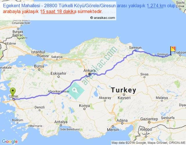 Egekent Mahallesi - 28800 Türkelli Köyü Görele Giresun arası yaklaşık olarak 90 km/h ile yukarıda belirtilen sürede olup, iki yerin kuş uçuşu uzaklığı (mesafesi) 1053'dir. Eğer belirtilen yerler arasında uçak seferi var ise bu süre uçakla 1 saat 37 dakika'ya kadar düşebilir. Yolculuk otobüsle 19 saat 53 dakika sürmektedir.