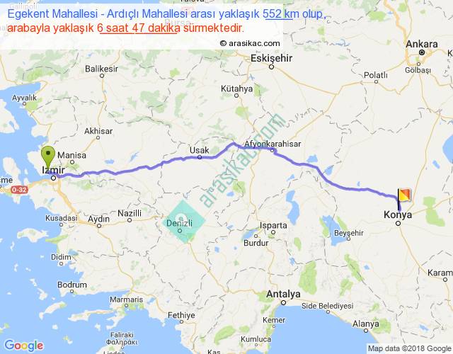 Egekent Mahallesi - Ardıçlı Mahallesi arası yaklaşık olarak 90 km/h ile yukarıda belirtilen sürede olup, iki yerin kuş uçuşu uzaklığı (mesafesi) 475'dir. Eğer belirtilen yerler arasında uçak seferi var ise bu süre uçakla 43 dakika'ya kadar düşebilir. Yolculuk otobüsle 8 saat 49 dakika sürmektedir.