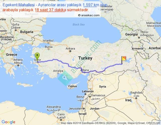 Egekent Mahallesi - Ayrancılar arası yaklaşık olarak 90 km/h ile yukarıda belirtilen sürede olup, iki yerin kuş uçuşu uzaklığı (mesafesi) 1283'dir. Eğer belirtilen yerler arasında uçak seferi var ise bu süre uçakla 1 saat 58 dakika'ya kadar düşebilir. Yolculuk otobüsle 1 gün 0 saat sürmektedir.
