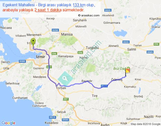 Egekent Mahallesi - Birgi arası yaklaşık olarak 90 km/h ile yukarıda belirtilen sürede olup, iki yerin kuş uçuşu uzaklığı (mesafesi) 92'dir. Yolculuk otobüsle 2 saat 37 dakika sürmektedir.